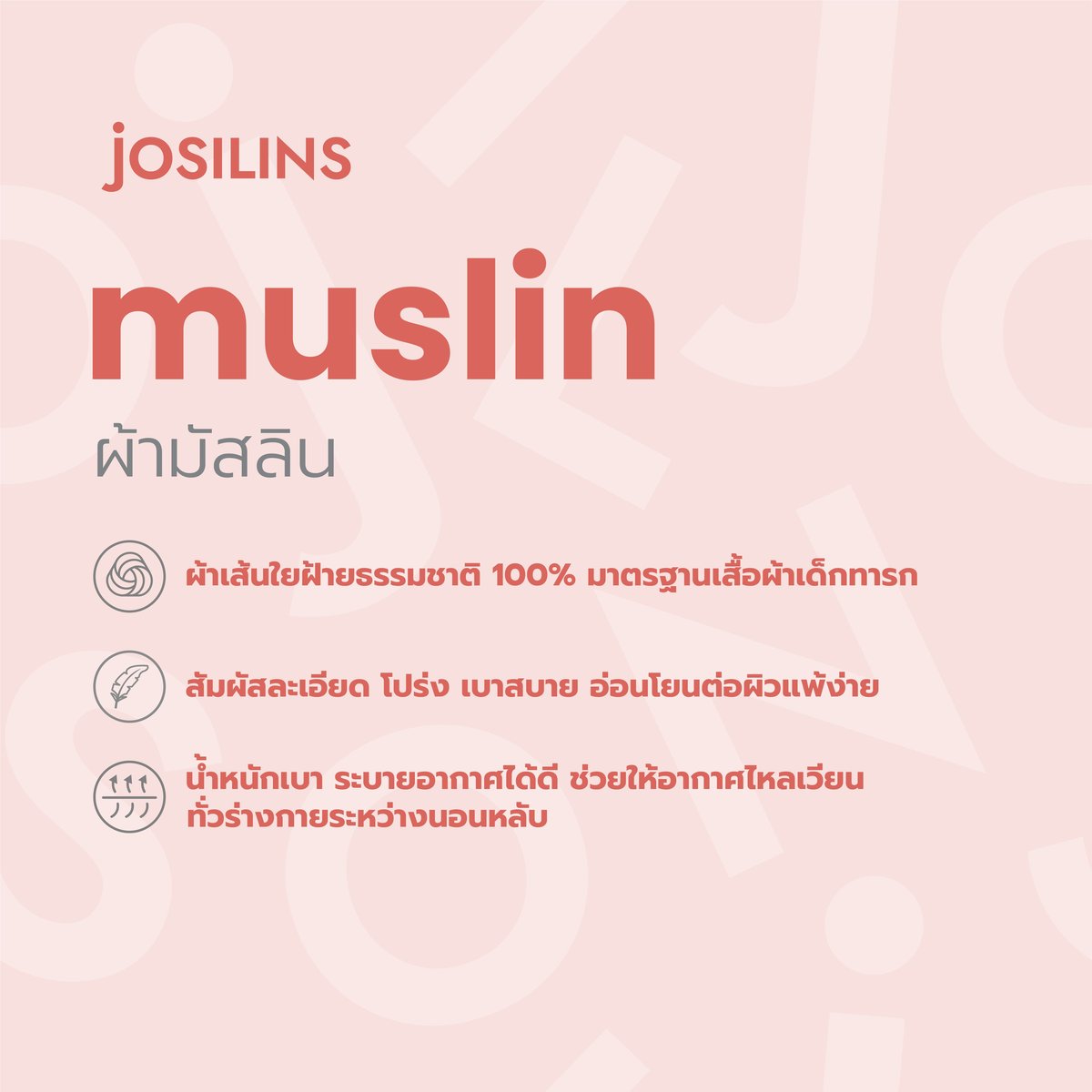 - เนื้อผ้ามัสลิน ผลิตจากผ้าฝ้ายคอตตอนแท้100% โดยการทอ เนื้อผ้าละเอียดโปร่ง บางเบา สัมผัสเย็นสบายผิว ระบายอากาศได้ดี แห้งเร็ว ซักแล้วแห้งง่าย