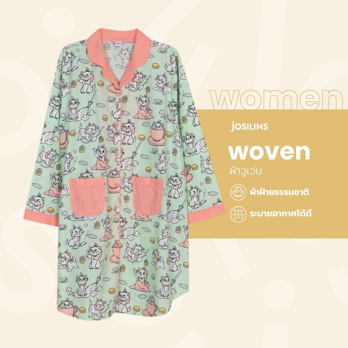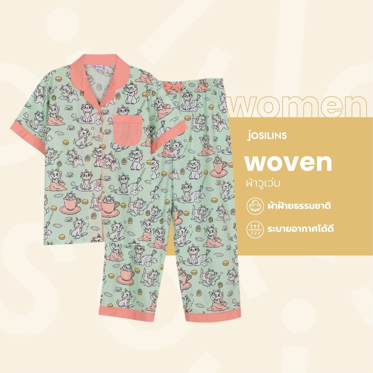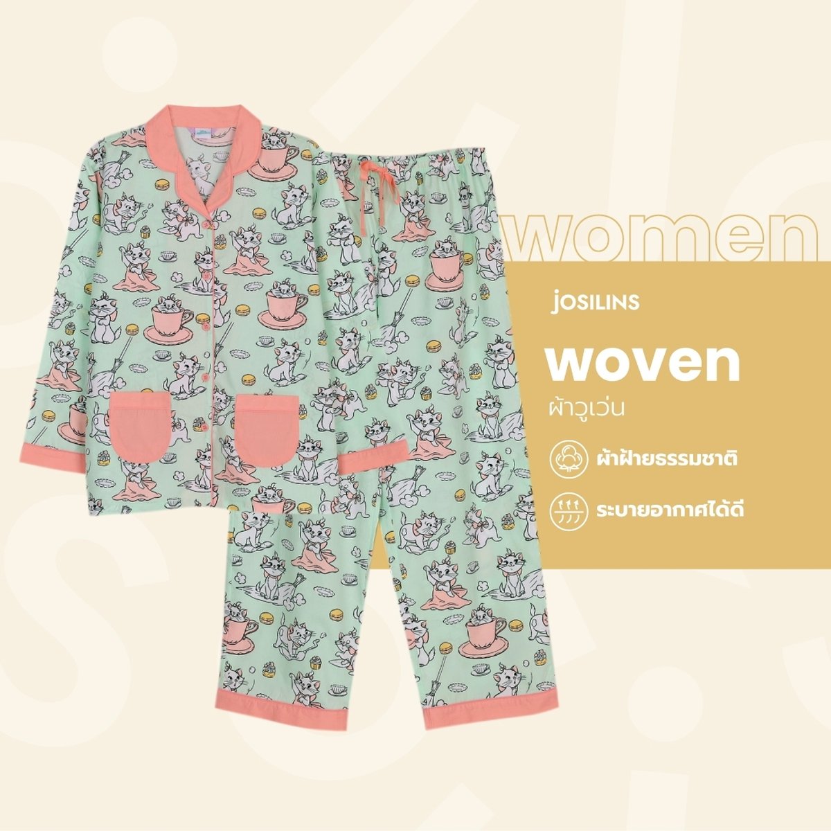 ชุดนอนผู้หญิง JOSILINS Disney Marie Little Helper ไซส์ F และไซส์ พลัส พลัสพลัส ผ้าวูเว่น
