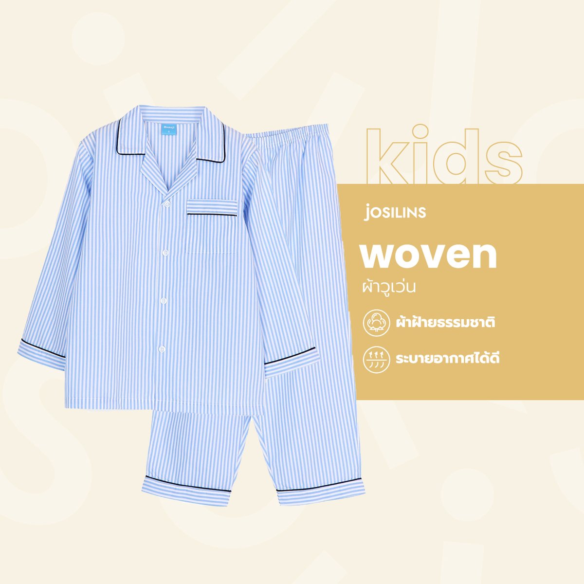 เนื้อผ้า : ผ้าคอตตอนวูเว่น (Woven Cotton) ผลิตจากผ้าเส้นใยธรรมชาติจากฝ้ายแท้ ไม่มีส่วนผสมเส้นใยสังเคราะห์ ทอลายเนื้อผ้าบางเบา เนียนละเอียด ใส่สบาย ระบายความร้อนดี ไม่อมความร้อน (ลักษณะคล้ายเสื้อเชิ้ตไม่ยืดแต่นุ่มไม่แข็ง) เหมาะกับอากาศร้อน
