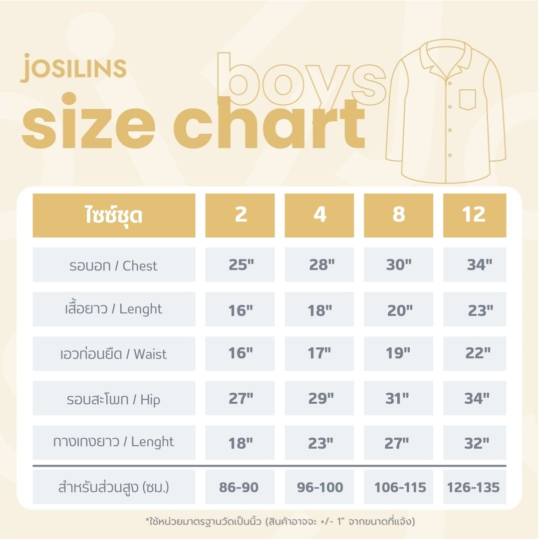 การเลือกไซส์ให้เทียบจากตารางรูปและเทียบไซส์ของน้องจากขนาดรอบอกและส่วนสูงจริงเป็นหลัก